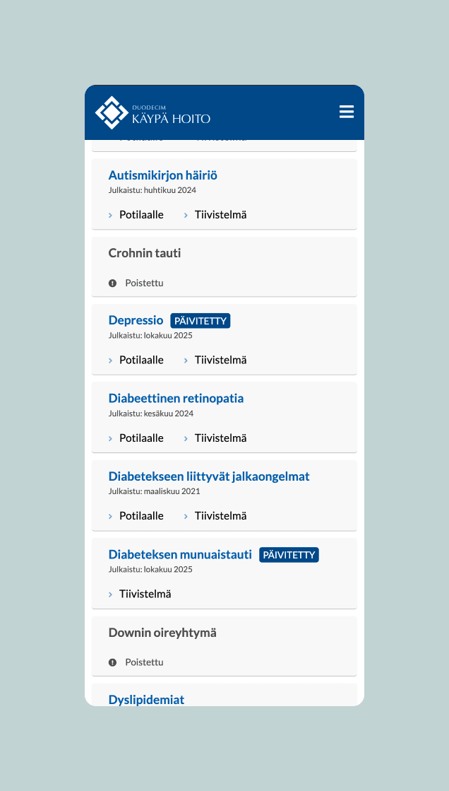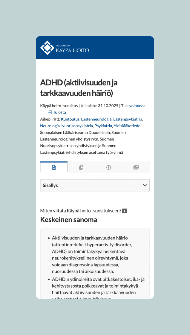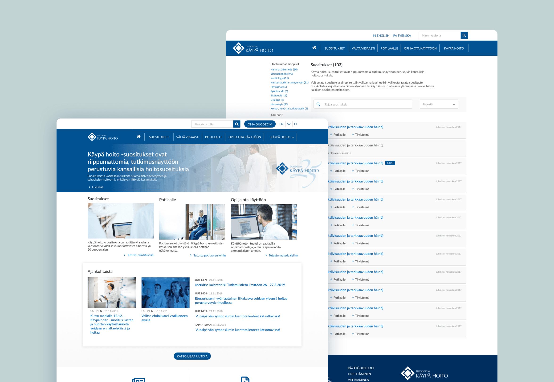 I worked as an in-house designer on the redesign of Käypä hoito, one of Finland’s most visited healthcare websites, with the goal of improving the experience without compromising trust or readability. The project focused on enhancing the findability of supplementary guideline materials while keeping the core reading experience distraction-free, and on supporting both healthcare professionals and citizens with clearly different usage patterns across desktop and mobile. The work was carried out in close collaboration with an agile product and development team.